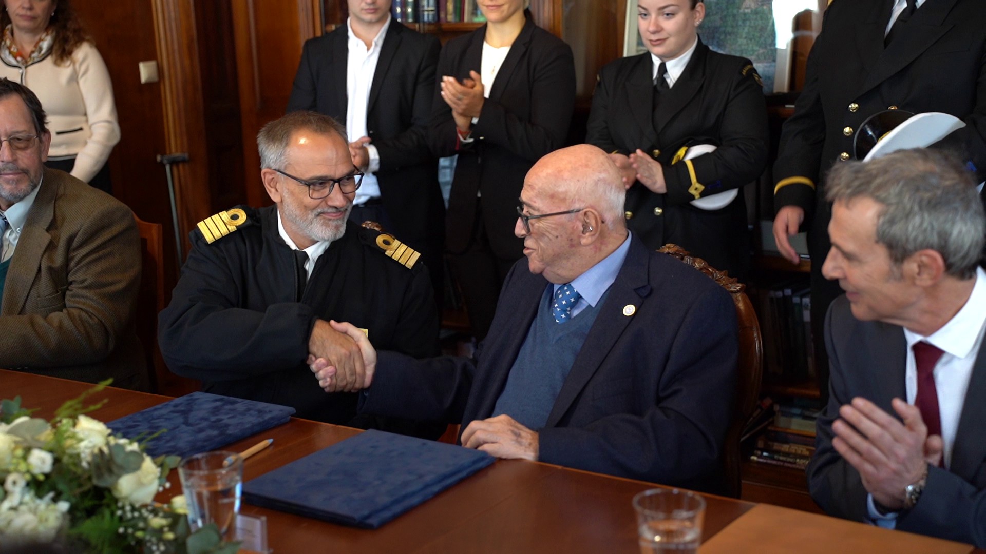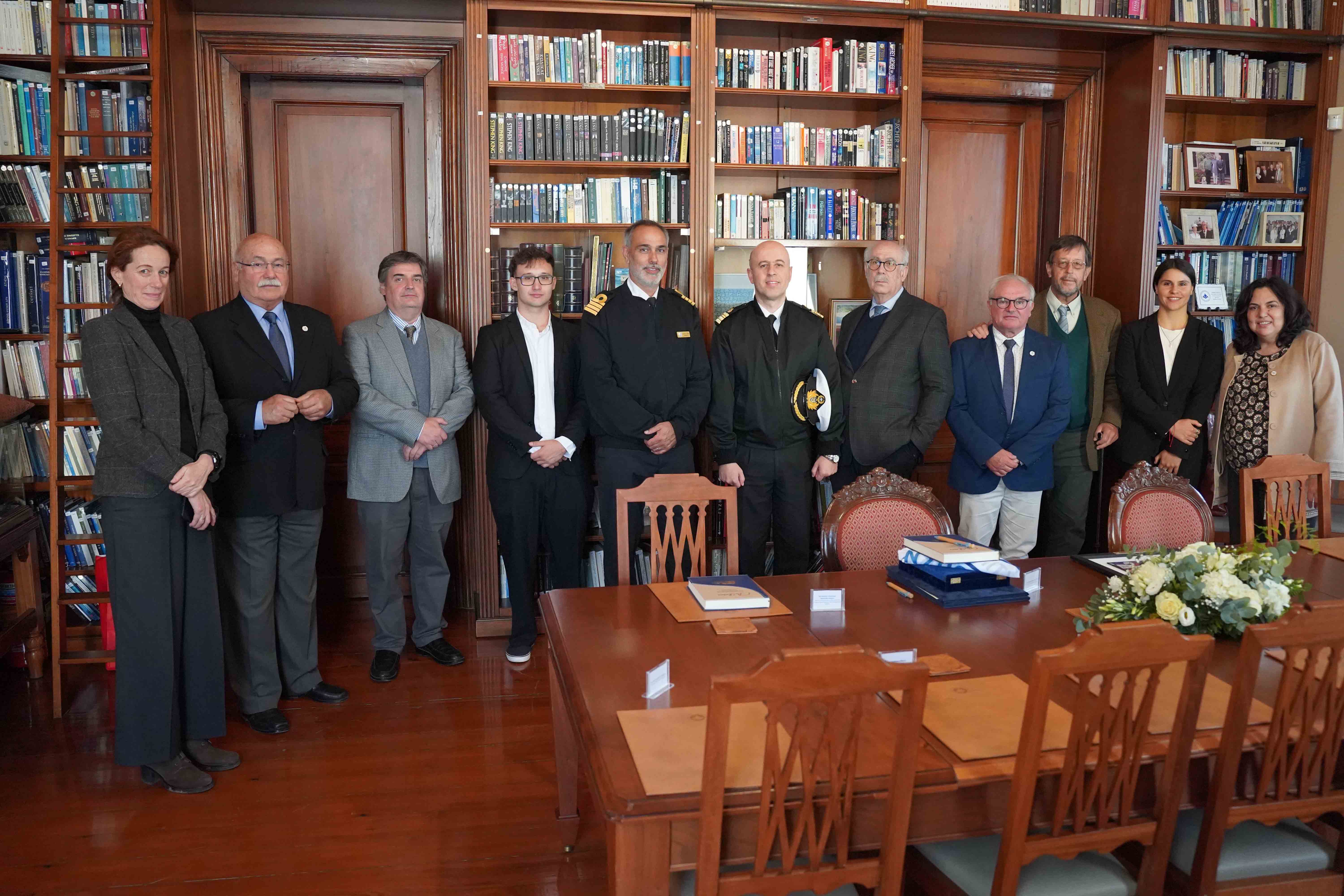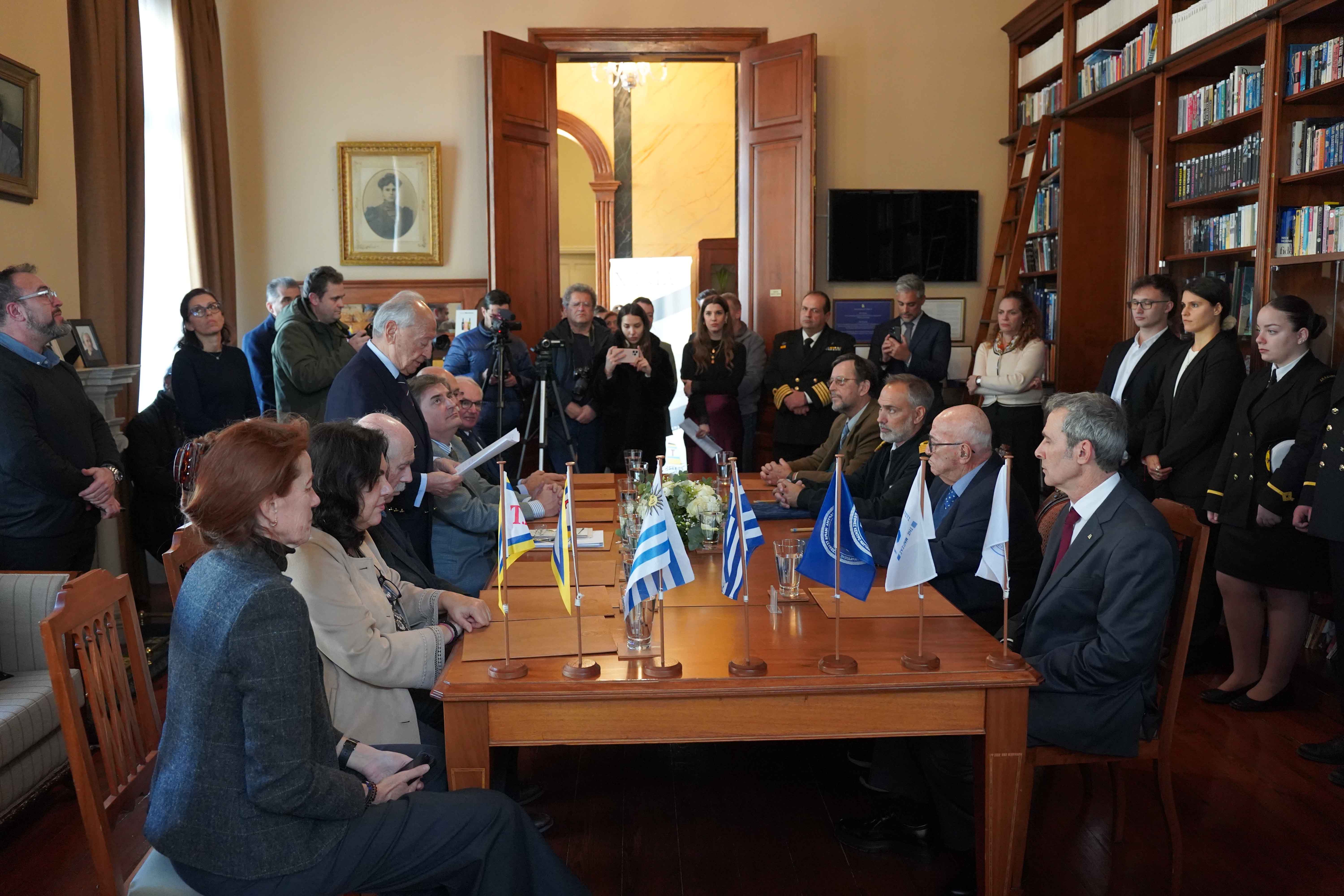 Στην δεξιά πλευρά του τραπεζίου, από δεξιά προς τα αριστερά (καθήμενοι): ο Καπτ. Κωνσταντίνος Μεννής, Διευθυντής Ακαδημίας Ε.Ν. ΤΕΕΝΣ, ο Ιδρυτής της ιδιωτικής Ακαδημίας ΕΝ Χίου & του ομώνυμου Ομίλου Εταιρειών Καπτα Παναγιώτης Ν. Τσάκος, ο κύριος Dario Gerardo Pepe Estellano, Διευθυντής της Ναυτικής Ακαδημίας της Ουρουγουάης, ο κύριος Joaquin Manfredo Lindmayer Schmidt, Διευθυντής του Τμήματος της Ακαδημίας Εμπορικού Ναυτικού της Ουρουγουάης.