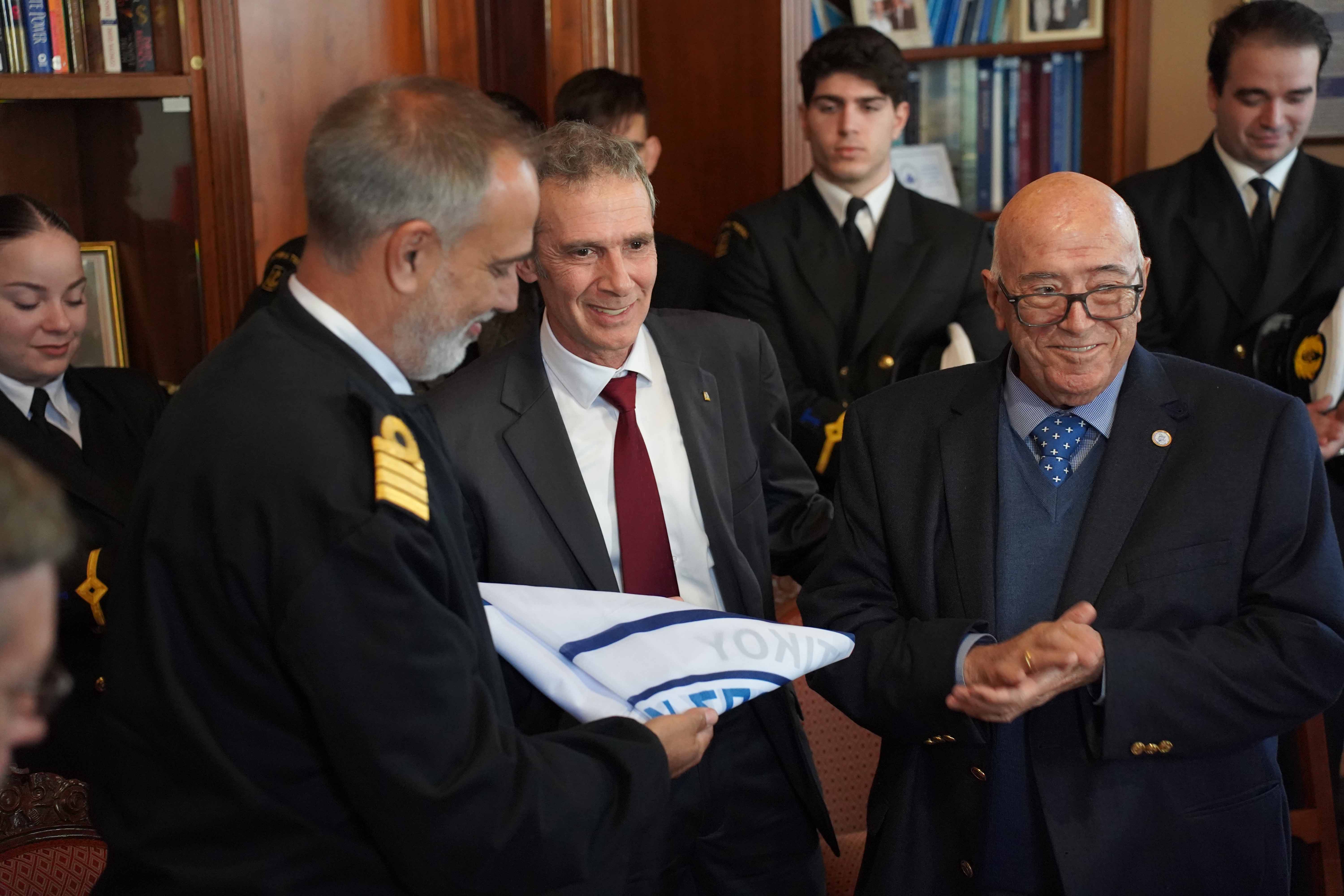 Νο. 4: Δωρεά Σημαίας Ακαδημίας Ε.Ν. ΤΕΕΝΣ προς την Ναυτική Ακαδημία της Ουρουγουάης. Από αριστερά ο κύριος Dario Gerardo Pepe Estellano, Διευθυντής της Ναυτικής Ακαδημίας της Ουρουγουάης, ο Καπτ. Κωνσταντίνος Μεννής, Διευθυντής Ακαδημίας Ε.Ν. ΤΕΕΝΣ και ο Ιδρυτής της ιδιωτικής Ακαδημίας ΕΝ Χίου & του ομώνυμου Ομίλου Εταιρειών Καπτα Παναγιώτης Ν. Τσάκος.