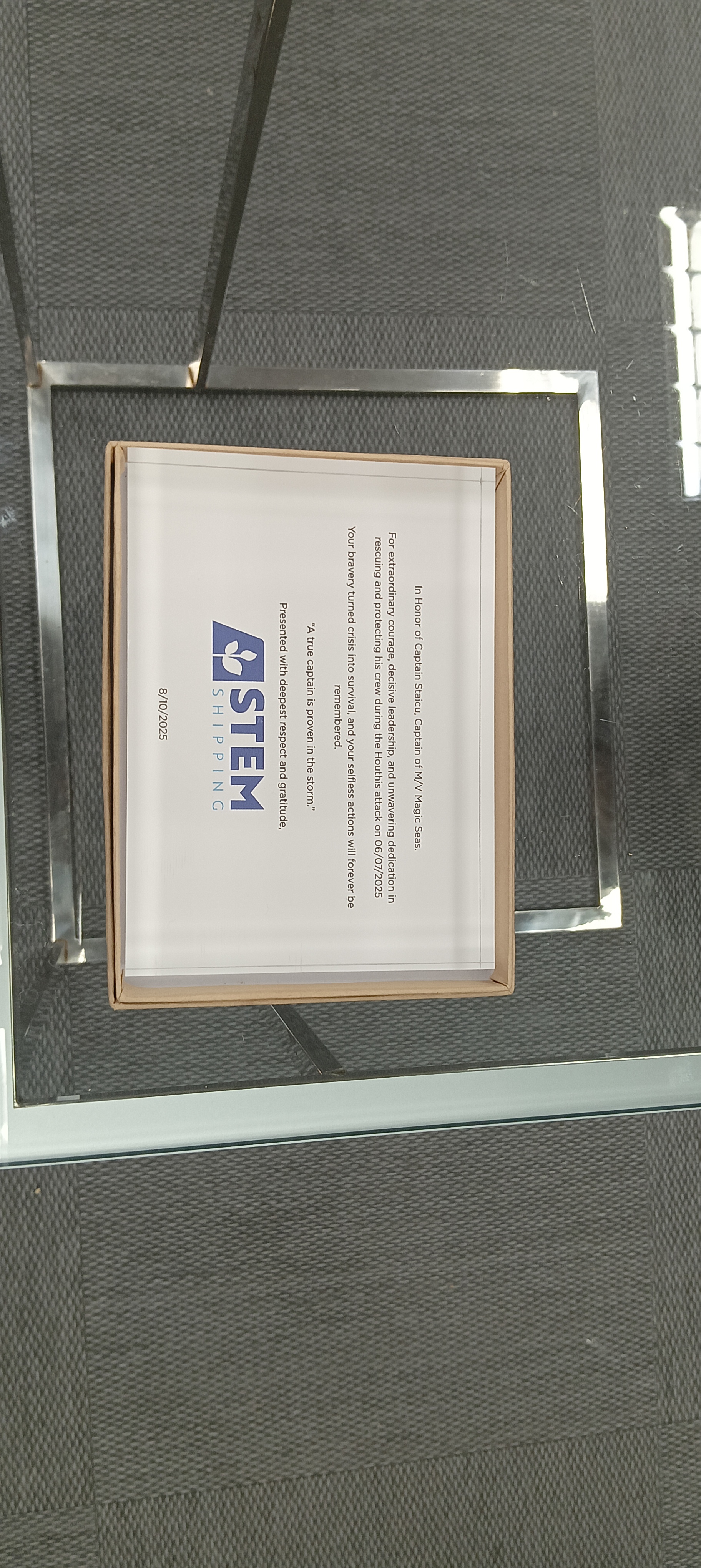 Το πλήρωμα και ο Πλοίαρχος του πλοίου “Magic Seas” τιμήθηκαν από την Stem Shipping για τη ναυτοσύνη και το θάρρος που επέδειξαν κατά την τρομοκρατική επίθεση στην Ερυθρά Θάλασσα.