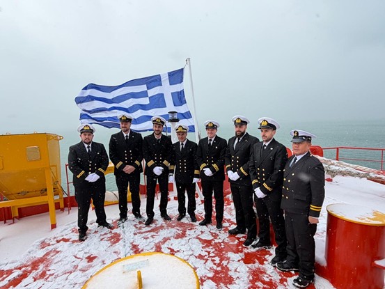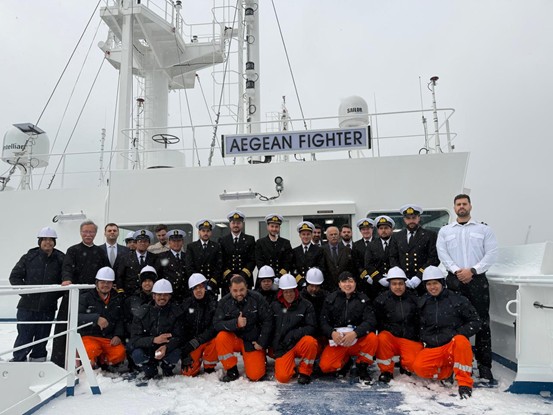 Image 2: Ο πλοίαρχος Παναγιώτης Σακελλάρης μαζί με τον πρώτο μηχανικό Γεώργιο Στάππα και τους αξιωματικούς του πλοίου