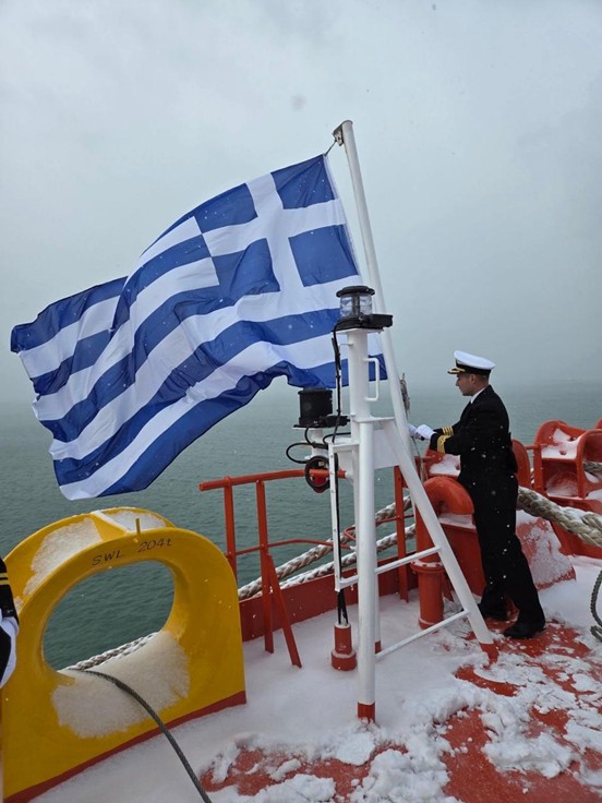 Image 1: Ο Πλοίαρχος Παναγιώτης Σακελλάρης κατά την ύψωση της ελληνικής σημαίας στο Aegean Fighter