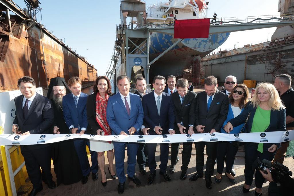 At the same event, the floating dock "Stratis G. Andreadis" was inaugurated. It is a new generation dock, Panamax class, which incorporates "green" and "smart" technologies. The "Stratis Andreadis" and the dock installed by the ONEX Group at Neorio Shipyards, in Syros, are the largest in Greece.