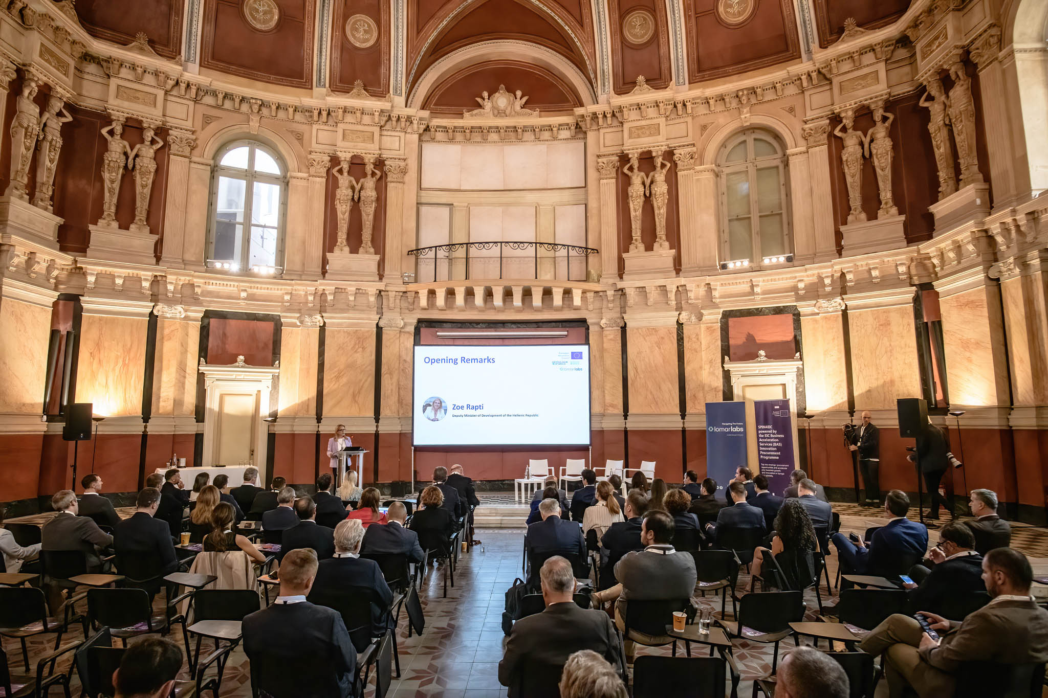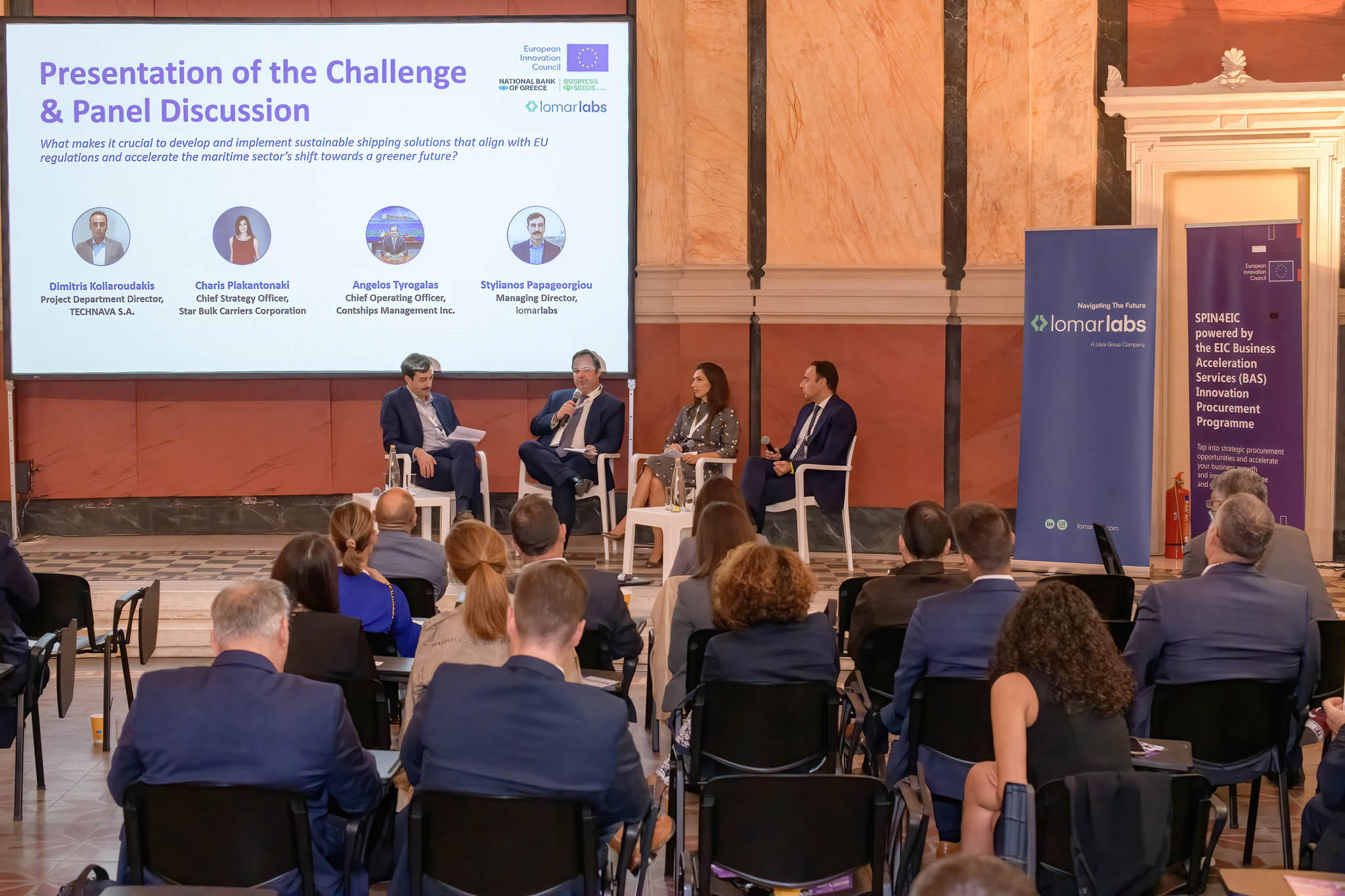 The Maritime Climate Action matchmaking event was a strategic collaboration between lomarlabs—a company focused on driving maritime innovation – and the European Innovation Council (EIC) Innovation Procurement Programme, powered by SPIN4EIC, and took place at the Old- Small Stock Exchange, hosted by the National Bank of Greece.