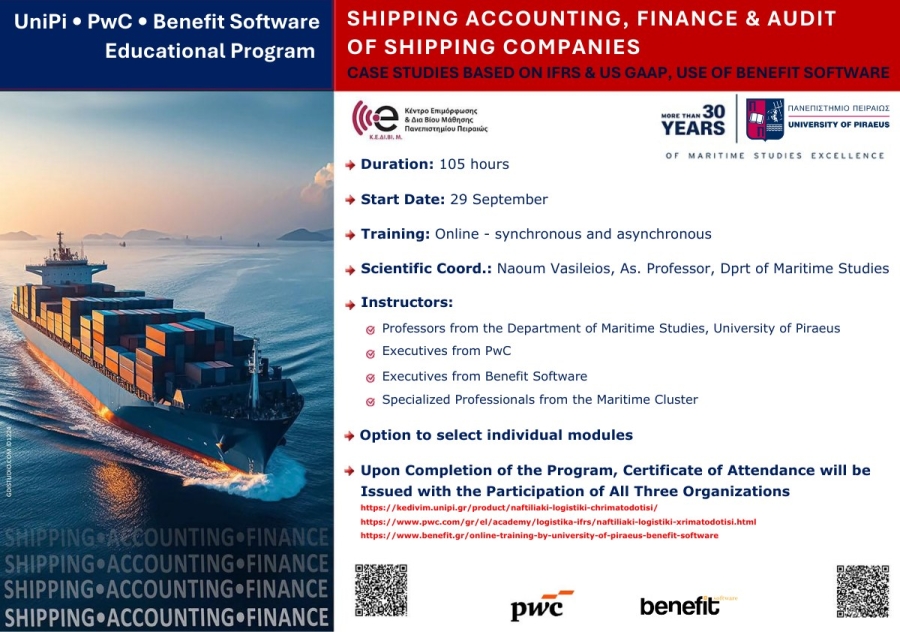 The program is offered online and is designed for both experienced professionals as well as students or graduates of economics, business administration, or maritime studies. Its aim is to provide participants with modern, comprehensive, and applied knowledge in Shipping Accounting and in specialized topics of Finance, Audit, and Taxation of Shipping Companies, enabling them to effectively respond to the particularities of today’s shipping business environment. The course lasts 105 hours, starts on September 29, 2025, and offers flexible participation, including the option to attend individual modules. Lectures are recorded and will remain available on the platform throughout the program. Upon completion, participants