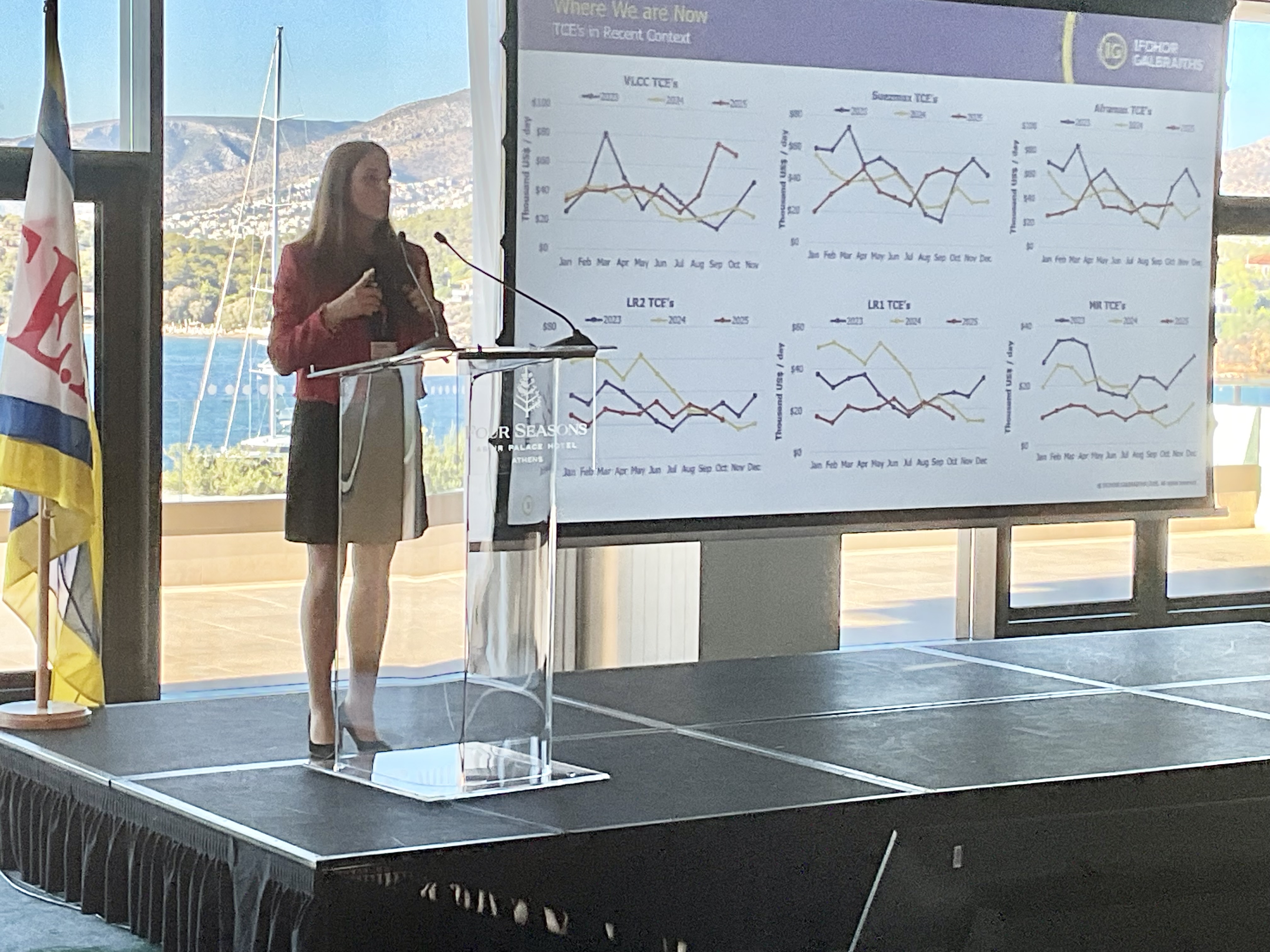 Anita Bartels, Head of Tankers and Offshore at IFCHOR GALBRAITHS, delivered a comprehensive presentation on tanker market trends. She highlighted a market characterized by strong spikes and elevated activity in recent years, alongside a rapidly aging fleet and slowing recycling. Bartels noted that output growth supports crude tankers, while a continuing shift in demand bolsters product tankers. She cautioned about potential ongoing volatility, the threat of trade war escalation to global economic growth, and the IMF's recent cut to global growth forecasts.