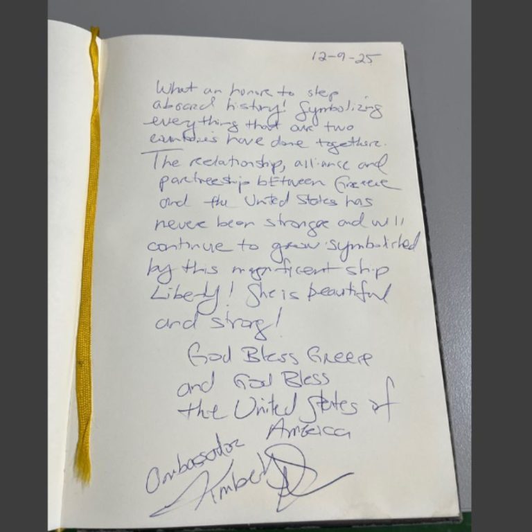 On December 9th, 2025, the U.S. Ambassador to Greece Kimberly Guilfoyle made a visit aboard the historic museum ship Hellas Liberty at the Port of Piraeus.