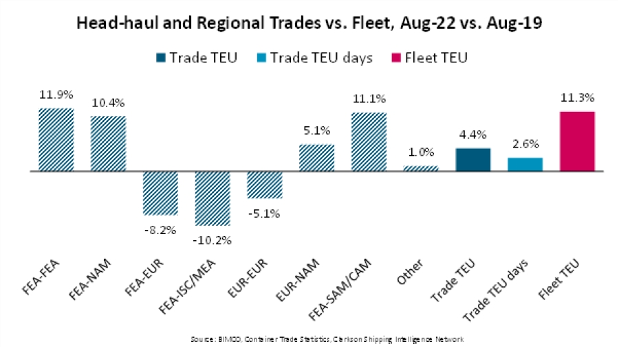 According to new data released by Container Trade Statistics, head-haul and regional trade volumes in August 2022 were at their lowest level since February 2022. The volumes were 3.8% lower than in July and 4.6% lower than August last year, confirming the lack of peak season volumes in key trade lanes. In comparison to pre-COVID volumes in August 2019, the volumes were only 4.4% higher and TEU days were just 2.6% higher due to a change in trade mix.